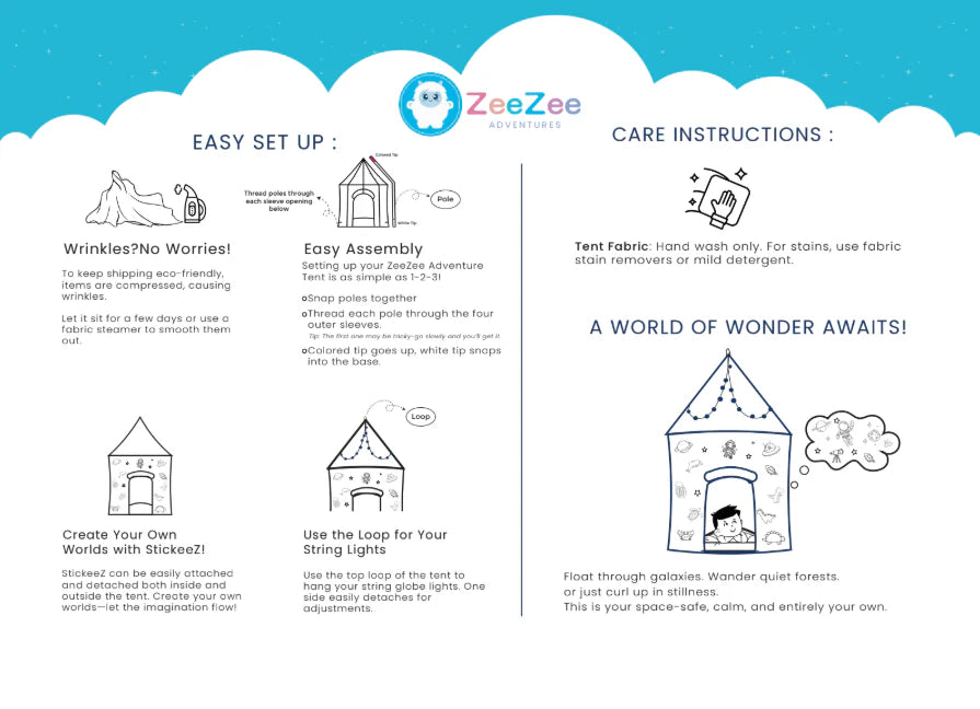 Yay! Your ZeeZee Adventure tent has made it to your home! In case you've misplaced your care card from your package, here’s a quick reminder as you get started.